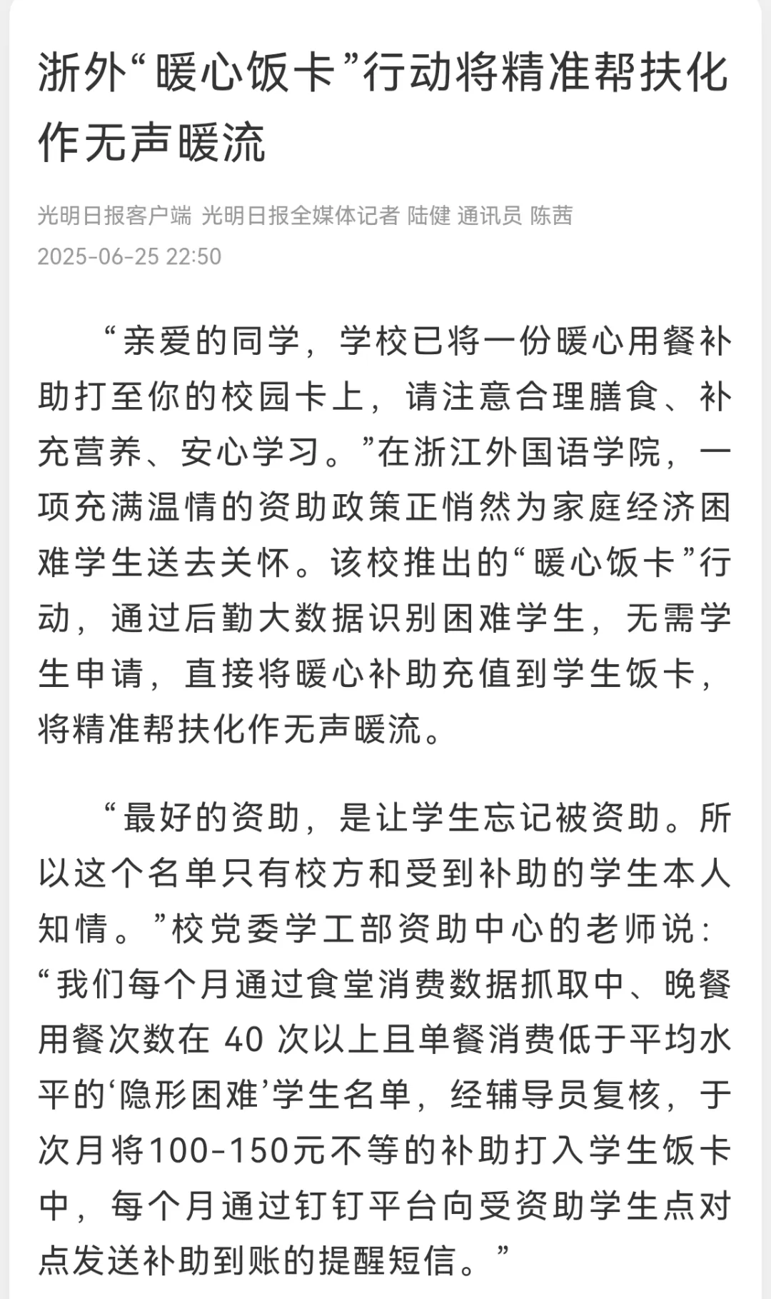 报道中指出:“亲爱的同学,学校已将一份暖心用餐补助打至你的校园卡上,请注意合理膳食、补充营养、安心学习。”在浙江外国语学院,一项充满温情的资助政策正悄然为家庭经济困难学生送去关怀。该校推出的“暖心饭卡”行动,通过后勤大数据识别困难学生,无需学生申请,直接将暖心补助充值到学生饭卡,将精准帮扶化作无声暖流。